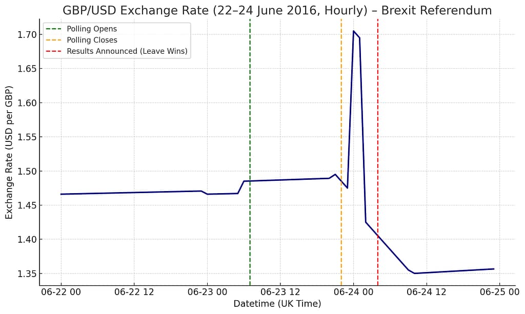 The hour-by-hour graph of GBP/USD from 22–24 June 2016, showing the pre-referendum rise, the strength of the pound during polling on the 23rd, and the sharp overnight crash as the Brexit results were confirmed early on the 24th. The initial rise occurred at the time Farage was making concessionary statements to the media.