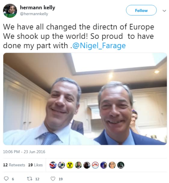 On the 23rd June, at 10:06pm just after Farage had made his concessionary statements to media outlets, Kelly posted an image to what was then Twitter. He wrote, “We have all changed the directn [sic] of Europe We shook up the world! So proud to have done my part with @Nigel_Farage”