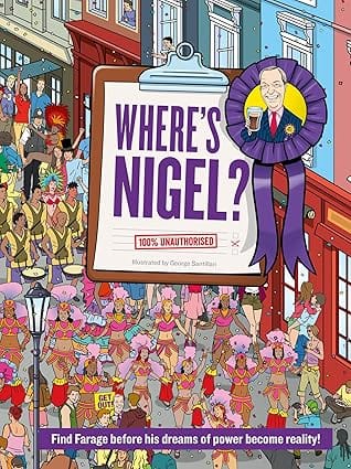 Where’s Nigel?: Find Farage Before His Dreams of Power Become Reality by George Santillan is a witty and irreverent political satire disguised as a “Where’s Wally?”-style puzzle book. Through colorful, chaotic illustrations, readers search for Nigel Farage hidden among caricatures of British politics and public life. Beneath the humour lies a sharp critique of populism and Farage’s influence on the UK’s political landscape. Santillan’s artwork is packed with clever visual jokes and cultural references, making each page both entertaining and thought-provoking. While playful in tone, the book delivers a biting commentary on modern politics and the cult of political celebrity. Shop for this book on Amazon here (Ad).