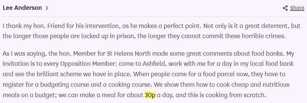 Anderson rose to national prominence in 2022 during a debate on the cost of living crisis. In a controversial intervention in the House of Commons, he suggested that meals could be cooked for as little as 30p and that people relying on food banks lacked cooking and budgeting skills.